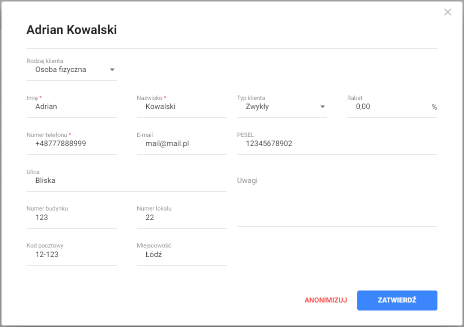 2. W oknie Dodawanie klienta wybrać Rodzaj klienta, uzupełnić wymagane pola Imię i Nazwisko oraz pozostałe opcjonalnie. W oknie można m.in. oznaczyć klienta jako zwykły lub VIP i przypisać domyślny rabat. Zmiany zapisać przyciskiem Zatwierdź.