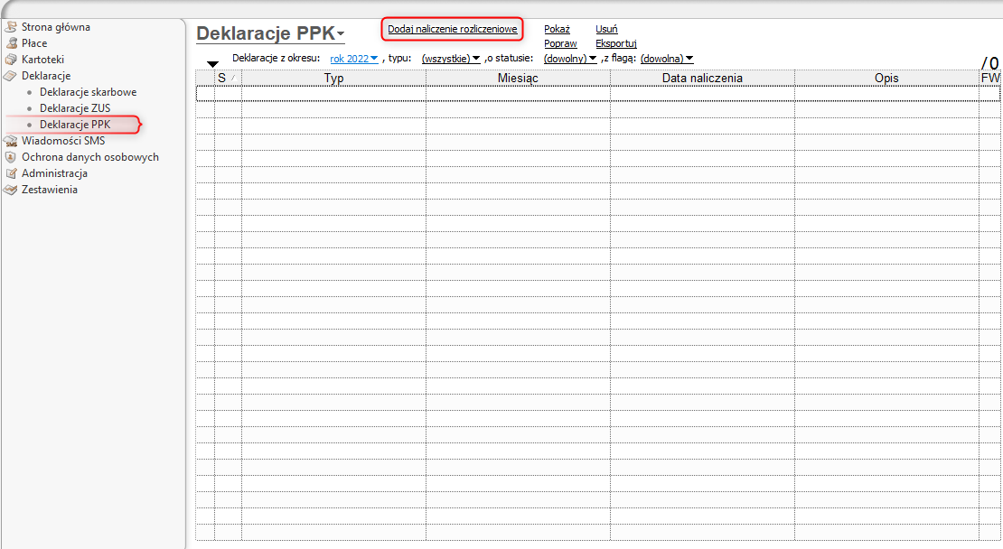 1. Przejść do modułu Deklaracje – Deklaracje PPK, a następnie w górnym menu wybrać Dodaj naliczenie rozliczeniowe.