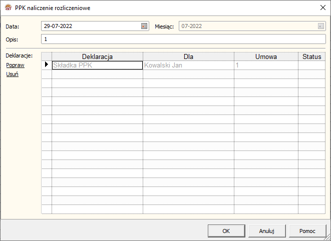 W naliczeniu rozliczeniowym zostaną ujęci pracownicy, którym w kartotece zaznaczono opcję Uczestnictwo w PPK, dla których w obrębie wybranego miesiąca naliczono wypłatę zawierającą wpłatę na PPK. Aby wygenerować naliczenie rozliczeniowe, należy: