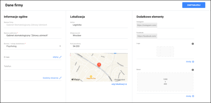 W sekcji Lokalizacja istnieje możliwość określenia adresu firmy. W tym celu można wykorzystać opcję Użyj lokalizacji.
