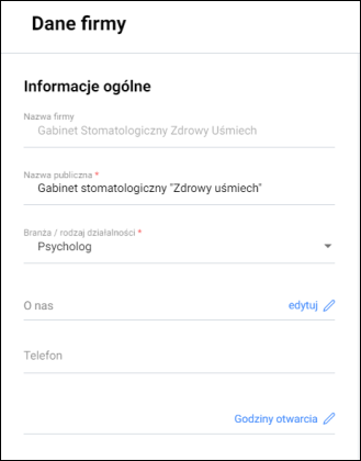 Poniżej z listy rozwijanej można zmienić branżę/rodzaj działalności oraz uzupełnić opis firmy.