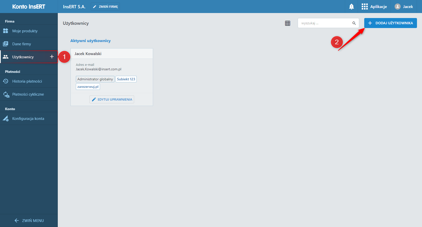 ​Dodawanie i usuwanie użytkowników aplikacji jest możliwe jedynie dla użytkownika typu administrator – uprawnienia można zweryfikować na stronie konto.insert.com.pl​.