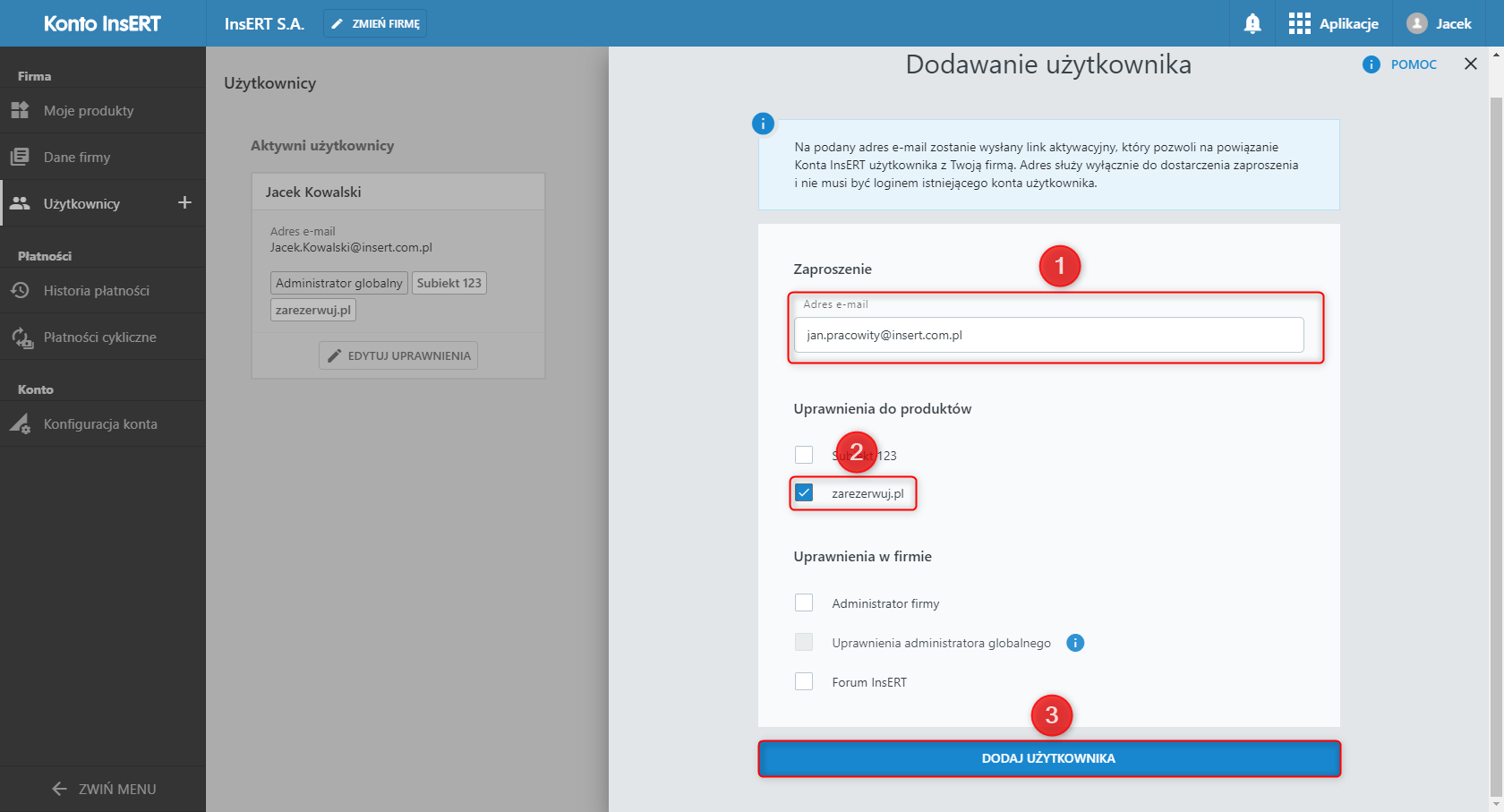 W formularzu nowego użytkownika uzupełnić Adres e-mail oraz zaznaczyć Uprawnienia do produktu. Dodatkowo nowemu użytkownikowi można nadać uprawnienia administratora firmy. Zmiany zatwierdzić przyciskiem Dodaj użytkownika.