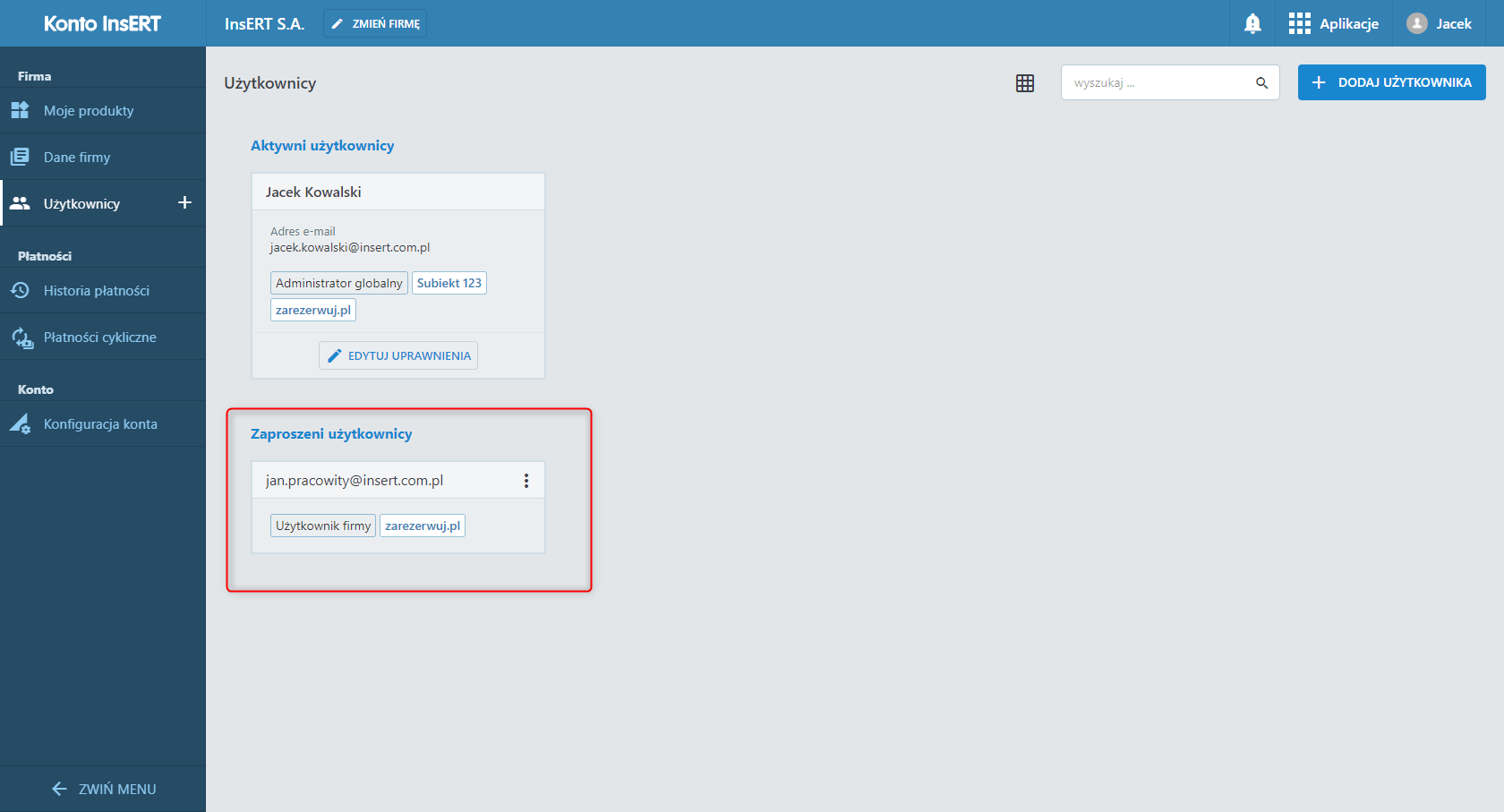 Po zatwierdzeniu zmian na liście użytkowników pojawi się nowa sekcja z informacjami o Zaproszonych użytkownikach