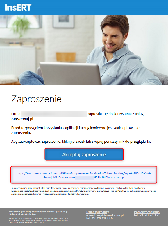 Po wybraniu przycisku Akceptuj zaproszenie nowy użytkownik zostanie przeniesiony do strony witryny zaproszenia. W treści zaproszenia ujęta jest informacja o wymaganiach. Należy pamiętać, że zapraszany użytkownik powinien mieć założone własne Konto InsERT.