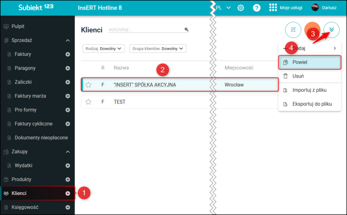 ​Wszystkie programy sprzedażowe InsERT umożliwiają powielanie kartotek towarowych i usługowe oraz klientów. Aby powielić kartotekę kontrahenta w programie Subiekt 123, należy przejść do modułu Klienci, zaznaczyć klienta, który ma zostać powielony, rozwinąć menu w prawym górnym rogu i kliknąć Powiel.