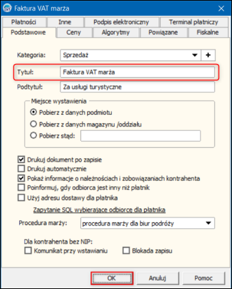 ​W celu ustawienia w programie Subiekt GT domyślnego tytułu dla faktury VAT marża należy: