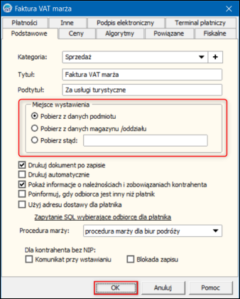 W celu ustawienia w programie Subiekt GT domyślnego miejsca wystawienia faktury VAT marża należy: