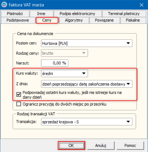 2. W oknie, które się wyświetli przejść na zakładkę Ceny i ustawić parametry dotyczące kursów walut: