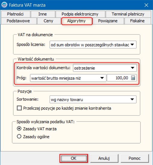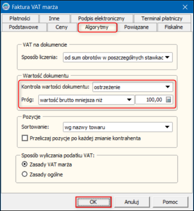 2. W oknie, które się wyświetli przejść na zakładkę Algorytmy i dokonać ustawień w sekcji Wartość dokumentu. Wskazać sposób kontroli wartości (ostrzeżenie, które pozwala zapisać dokument lub blokada zapisu) i ustawić Próg. Zmiany zapisać przyciskiem OK.
