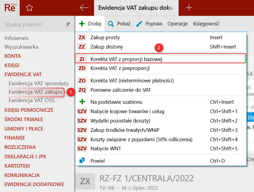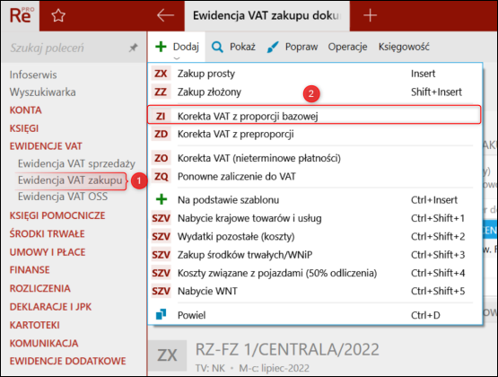 1. Przejść do modułu Ewidencje VAT – Ewidencja VAT zakupu i z górnego menu wybrać Dodaj – Korekta VAT z proporcji bazowej.