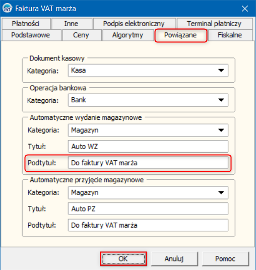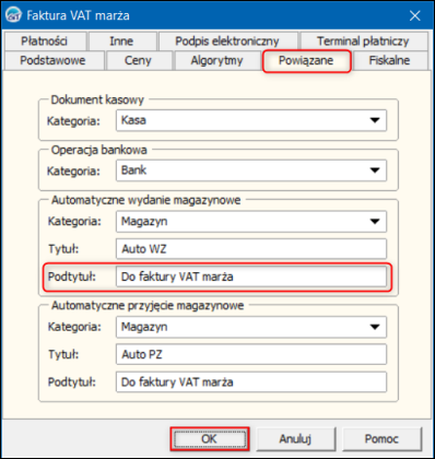 2. W oknie, które się wyświetli przejść na zakładkę Powiązane i wpisać domyślny Podtytuł w sekcji Automatyczne wydanie magazynowe. Zmiany zapisać przyciskiem OK.