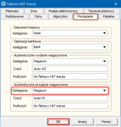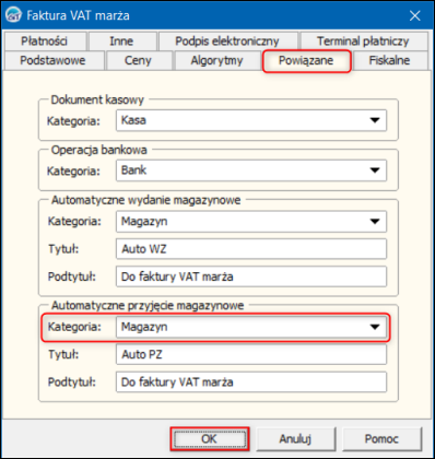 2. W oknie, które się wyświetli przejść na zakładkę Powiązane i wybrać domyślną Kategorię w sekcji Automatyczne przyjęcie magazynowe. Zmiany zapisać przyciskiem OK.