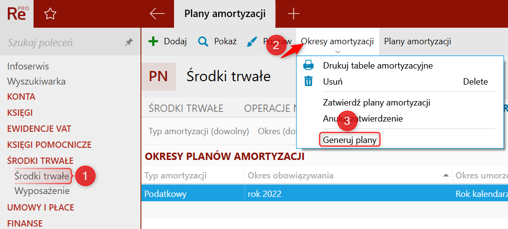 1. Zaznaczyć wybrany okres planów amortyzacji, a następnie wybrać z górnego menu Okresy amortyzacji – Generuj plany.