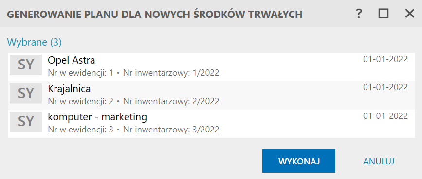 2. Zatwierdzić wygenerowanie planów amortyzacji przyciskiem Wykonaj.