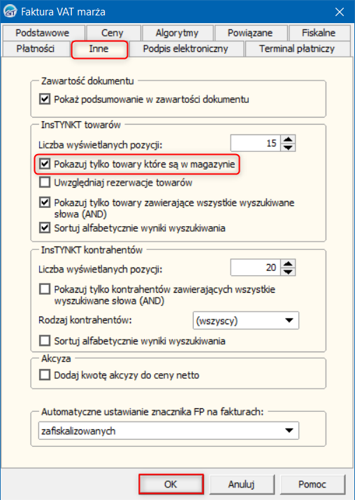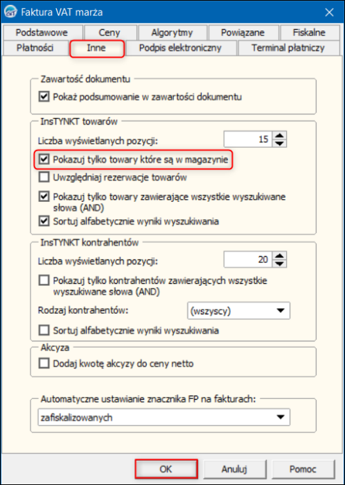 2. W oknie Faktura VAT marża przejść na zakładkę Inne i zaznaczyć opcję Pokazuj tylko towary, które są w magazynie w sekcji InsTYNKT towarów. Zmiany zapisać przyciskiem OK.