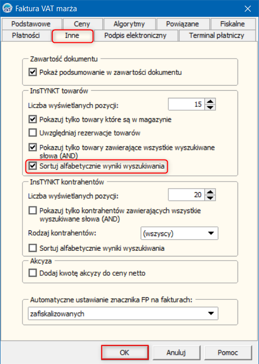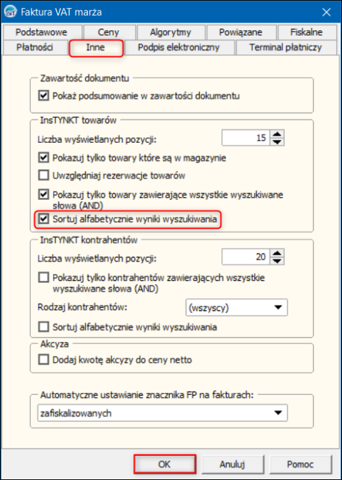 2. W oknie Faktura VAT marża przejść na zakładkę Inne i zaznaczyć opcję Sortuj alfabetycznie wyniki wyszukiwania w sekcji InsTYNKT towarów. Zmiany zapisać przyciskiem OK.