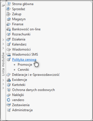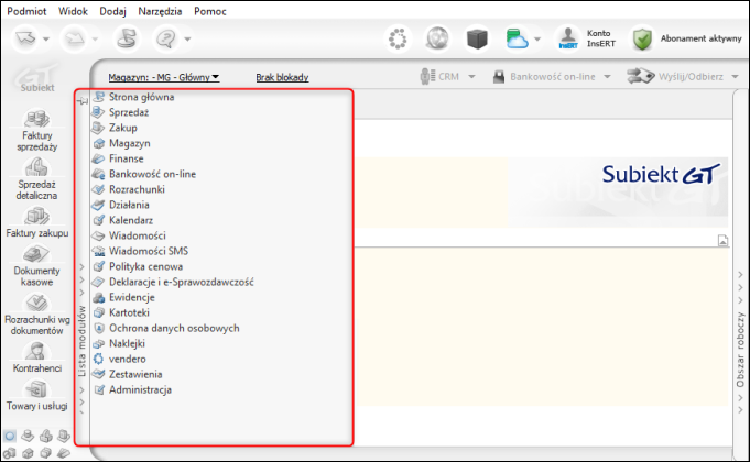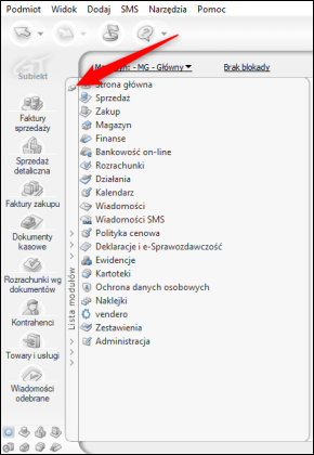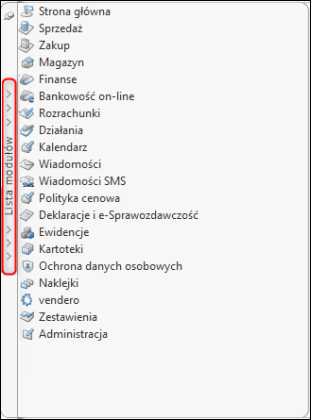 Lista modułów to rodzaj paska przedstawionego w postaci listy. Znajdują się na nim najważniejsze grupy modułów (oraz poszczególne moduły). Aby wywołać żądany moduł, należy kliknąć myszką na odpowiedniej pozycji.