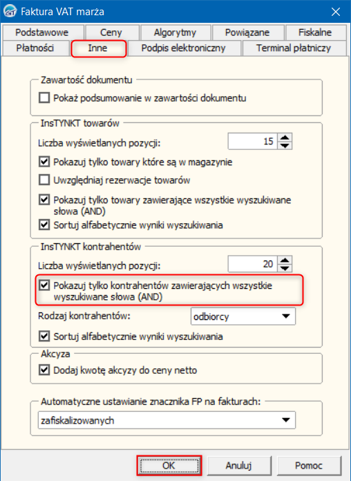 2. W oknie Faktura VAT marża przejść na zakładkę Inne i zaznaczyć opcję Pokazuj tylko kontrahentów zawierających wszystkie wyszukiwane słowa (AND) w sekcji InsTYNKT kontrahentów. Zmiany zapisać przyciskiem OK.