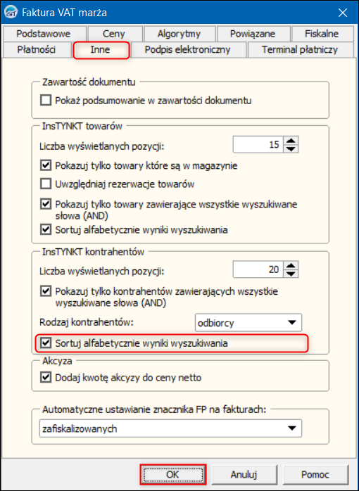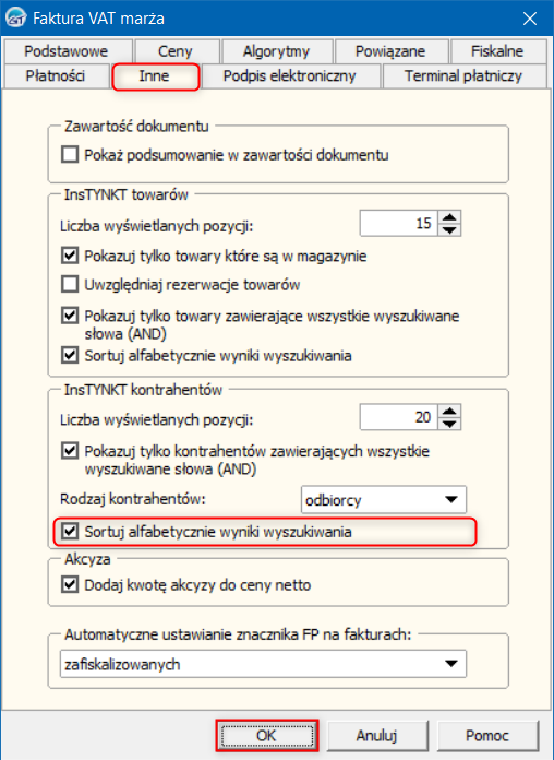 2. W oknie Faktura VAT marża przejść na zakładkę Inne i zaznaczyć opcję Sortuj alfabetycznie wyniki wyszukiwania w sekcji InsTYNKT kontrahentów. Zmiany zapisać przyciskiem OK.