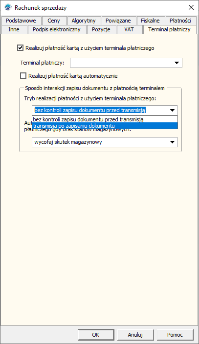 2. Na zakładce Terminal płatniczy w sekcji Tryb realizacji płatności z użyciem terminala płatniczego wskazać opcję transmisja po zapisaniu dokumentu.