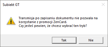 3. Transmisja po zapisaniu dokumentu nie pozwala na korzystanie z promocji ZenCard. Komunikat należy zatwierdzić przyciskiem Tak. Zatwierdzić zmiany przyciskiem OK.