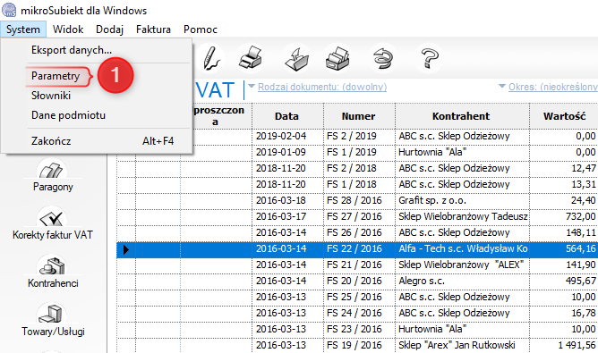1. Rozwinąć górne menu System i wybrać Parametry.