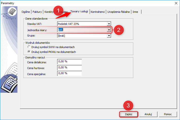 2. Na zakładce Towary i usługi wybrać domyślną Jednostkę miary i zatwierdzić przyciskiem Zapisz.