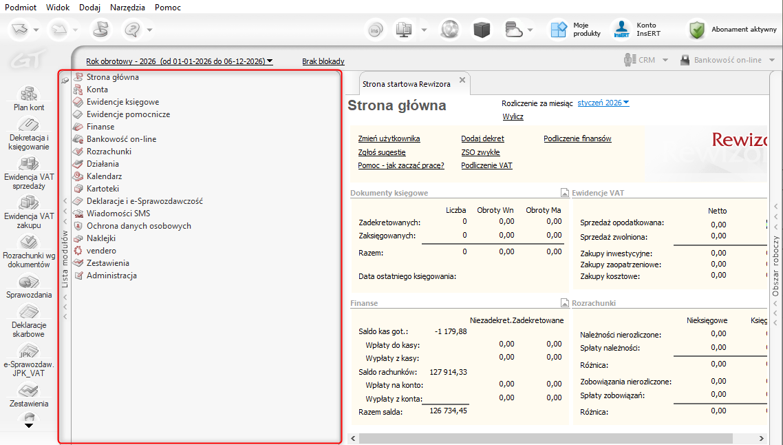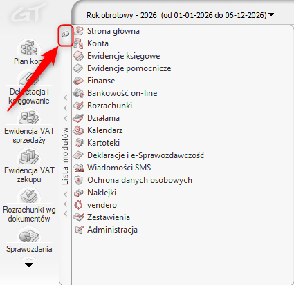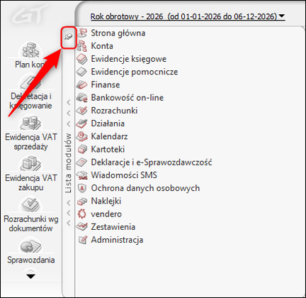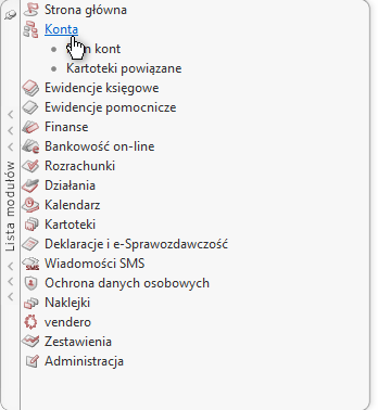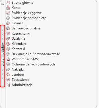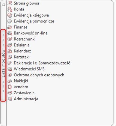 Lista modułów to rodzaj paska przedstawionego w postaci listy. Znajdują się na nim najważniejsze grupy modułów (oraz poszczególne moduły). Aby wywołać żądany moduł, należy kliknąć myszką na odpowiedniej pozycji.
