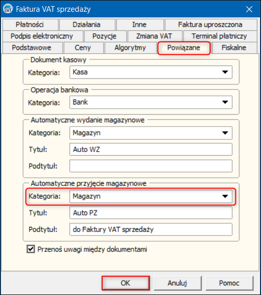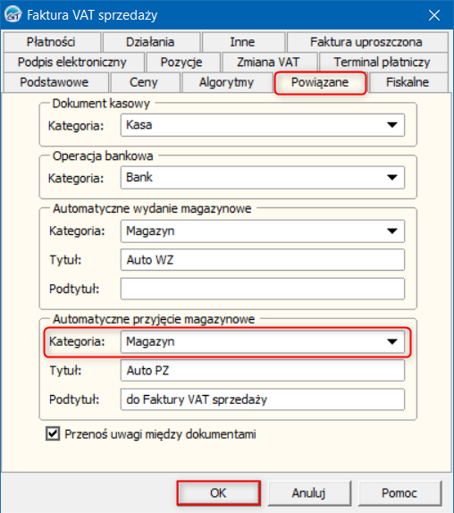 2. W oknie, które się wyświetli przejść na zakładkę Powiązane i wybrać domyślną Kategorię w sekcji Automatyczne przyjęcie magazynowe. Zmiany zapisać przyciskiem OK.