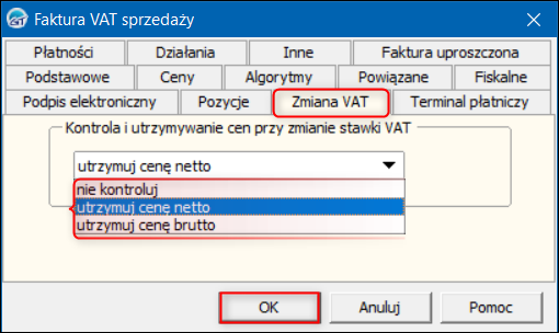 2. W oknie, które się wyświetli przejść na zakładkę Zmiana VAT i ustawić, która cena (netto lub brutto) ma pozostać niezmieniona podczas zmiany stawki VAT. Zmiany zapisać przyciskiem OK.