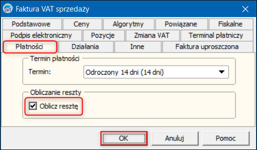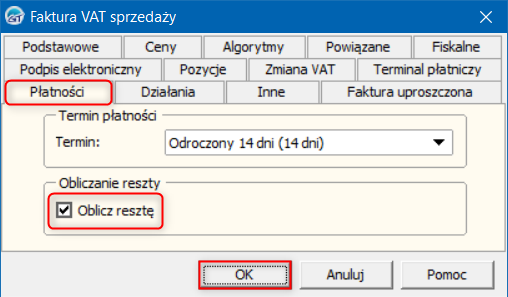 2. W oknie, które się wyświetli przejść na zakładkę Płatności i zaznaczyć opcję Oblicz resztę. Zmiany zapisać przyciskiem OK.