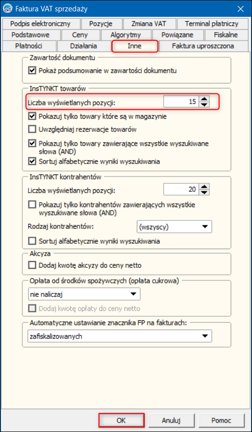 2. W oknie Faktura VAT sprzedaży przejść na zakładkę Inne i wybrać Liczbę wyświetlanych pozycji w sekcji InsTYNKT towarów. Zmiany zapisać przyciskiem OK.