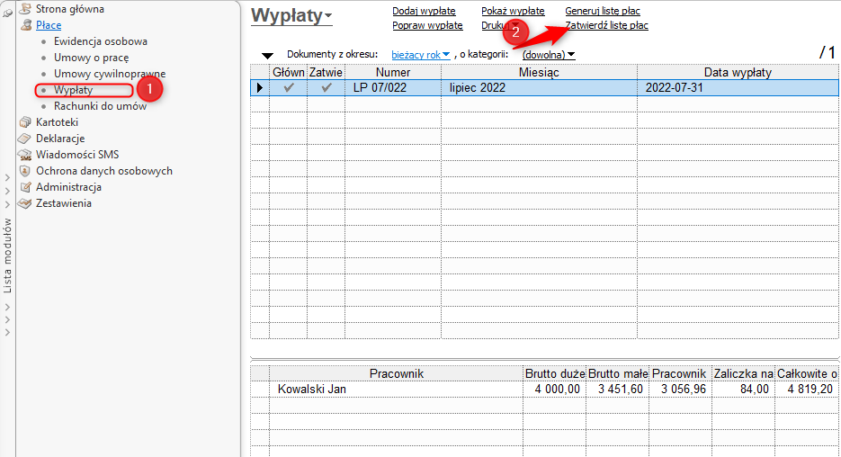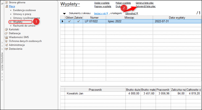 1. Przejść do modułu Płace – Wypłaty, a następnie Zatwierdzić listę płac (opcja jest również dostępna po kliknięciu listy płac prawym przyciskiem myszy).