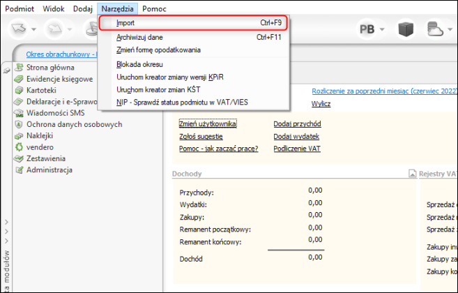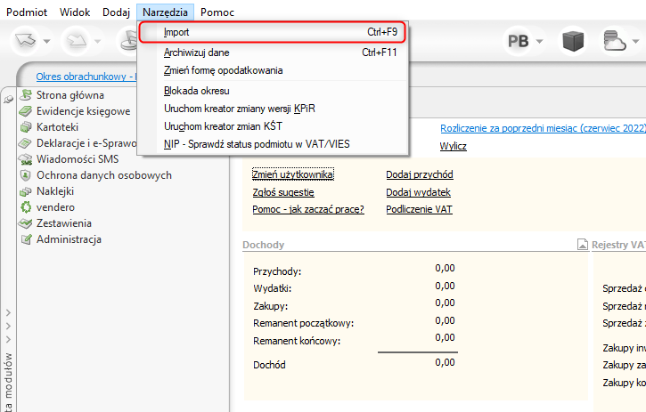 2. W programie księgowym rozwinąć górne menu Narzędzia i wybrać opcję Import.