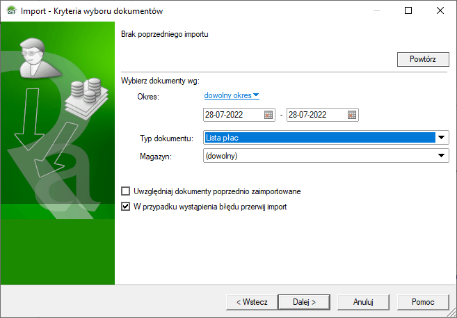 4. W następnym kroku należy wybrać Okres, za który mają zostać zaimportowane dokumenty i przejść Dalej.