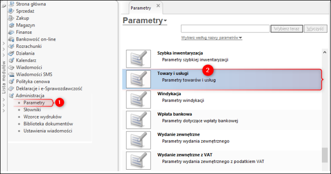 Aby zdefiniować domyślną jednostkę miary dla nowych pozycji, należy przejść do modułu Parametry – Towary i usługi.