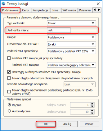 Pole Jednostka miary na zakładce Podstawowe pozwala określić domyślną jednostkę dla nowych pozycji towarowych. Należy pamiętać, że wprowadzone zmiany nie działają wstecz. Zmiany zatwierdzić przyciskiem OK.
