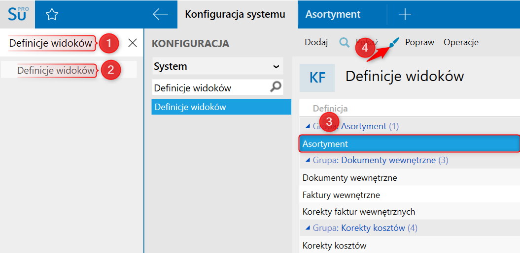 1. W lewym górnym rogu programu, w wyszukiwarce wpisać Definicje widoków, wejść w wyszukany moduł, zaznaczyć widok, któremu ma zostać nadane Domyślne polecenie i kliknąć górne menu Popraw.