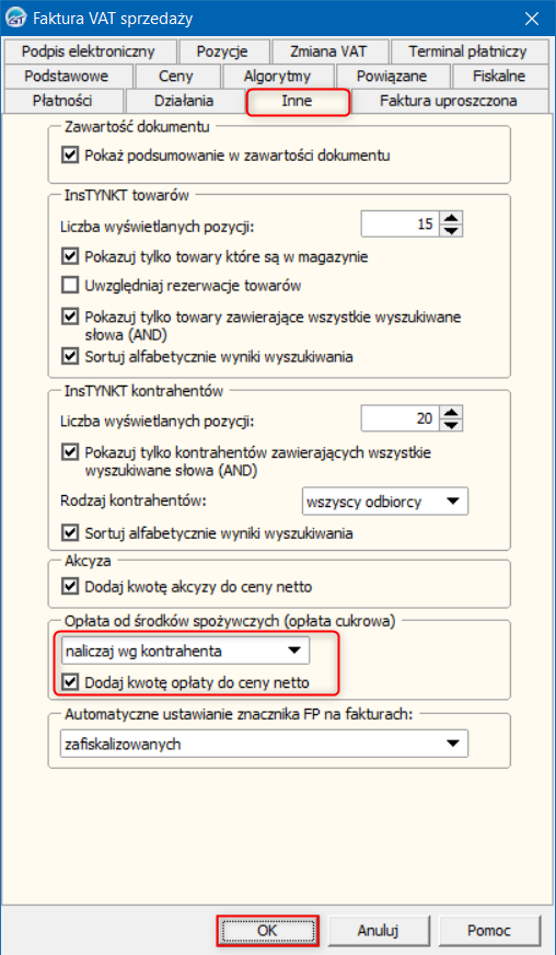 2. W oknie, które się wyświetli przejść na zakładkę Inne i ustawić w sekcji Opłata od środków spożywczych (opłata cukrowa) jedną z trzech opcji: