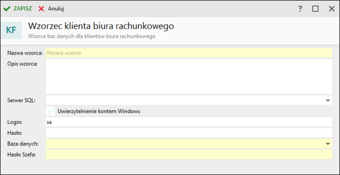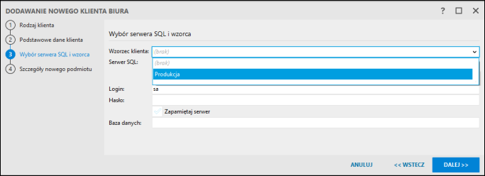 W kreatorze dodawania nowego klienta biura i tworzenia bazy danych udostępniono możliwość wskazania bazy wzorcowej, w której wcześniej zdefiniowano np.: