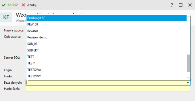 3. Wprowadzić nazwę serwera SQL i wskazać z listy utworzoną wzorcową bazę danych, która ma być wykorzystywana jako szablon przy tworzeniu baz danych nowych klientów