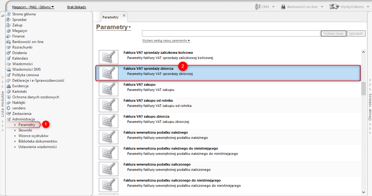 1. Przejść do modułu Administracja – Parametry i wybrać Faktura VAT sprzedaży zbiorcza.