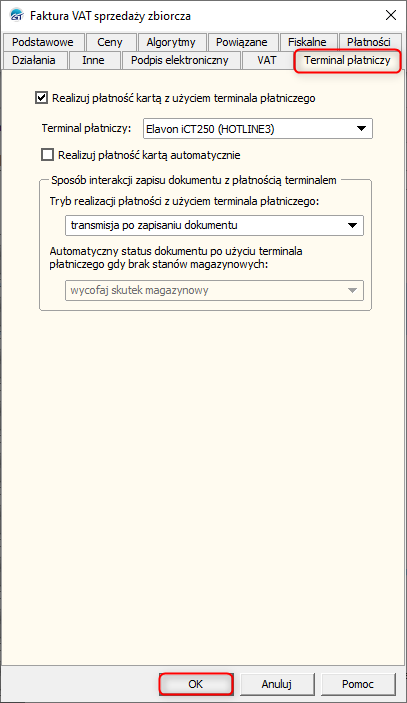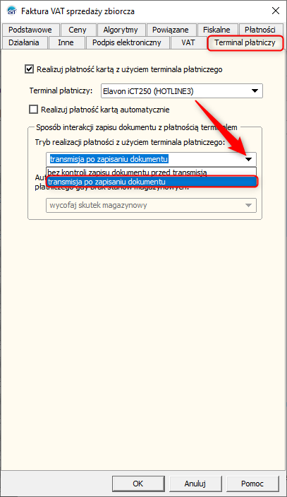 2. Na zakładce Terminal płatniczy w sekcji Tryb realizacji płatności z użyciem terminala płatniczego wskazać opcję transmisja po zapisaniu dokumentu.