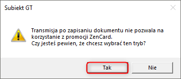 3. Transmisja po zapisaniu dokumentu nie pozwala na korzystanie z promocji ZenCard. Komunikat należy zatwierdzić przyciskiem Tak.