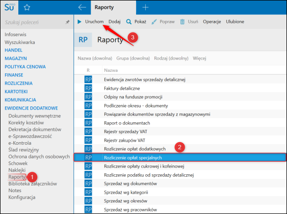 1. Przejść do modułu Rap​orty, odnaleźć i Uruchomić raport Rozliczenie opłat specjalnych.