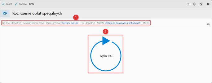 2. Filtr Opłata ustawić na Opłata od opakowań plastikowych, pozostałe filtry ustawić według własnej specyfiki pracy, następnie kliknąć Wylicz.