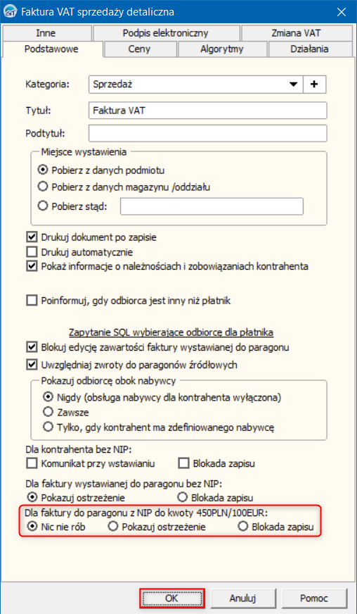 2. W oknie, które się wyświetli wybrać jedną z dwóch opcji (pokazuj ostrzeżenie lub blokada zapisu) w polu Dla faktury do paragonu z NIP do kwoty 450PLN/100EUR. Ustawienie opcji Nic nie rób pozwoli wystawić taki dokument bez żadnego komunikatu. Zmiany zapisać przyciskiem OK.