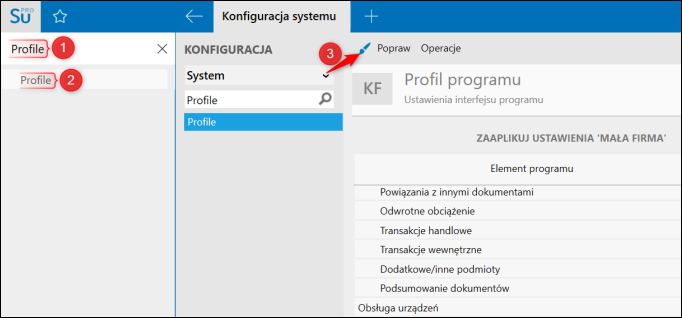 1. W lewym, górnym rogu programu, w wyszukiwarce wpisać Profile, wejść w wyszukany moduł i kliknąć górne menu Popraw.