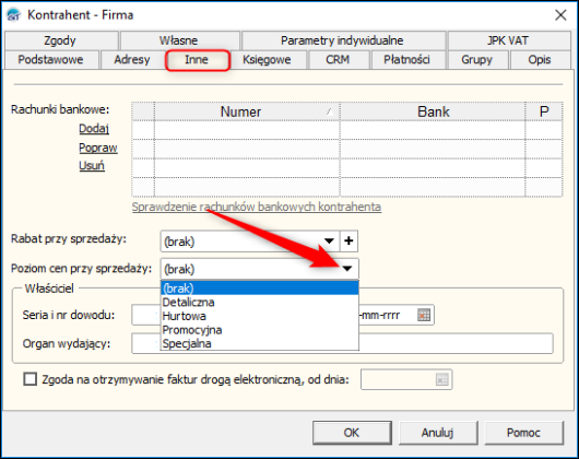 2. Na zakładce Inne rozwinąć opcję Poziom cen przy sprzedaży. Na liście dostępne są poziomy cen zdefiniowane przez użytkownika w module Parametry – Towary i usługi, gdzie można zdefiniować do 10 poziomów cen sprzedaży, a domyślnie zdefiniowane są trzy poziomy: detaliczna, hurtowa i specjalna. Zmiany zatwierdzić przyciskiem OK.